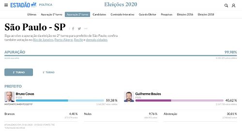 La amplia victoria de Bruno Covas, del PSDB, en la principal ciudad del país, acompañada de un altísimo índice de abstención, resume los resultados de las elecciones brasileñas de este domingo. Efectivamente, en San Pablo, el nuevo “mimado” del imperialismo y la derecha como líder de la “izquierda” bolsonarista (ya que actúa en connivencia con el Gobierno de Bolsonaro, conteniendo todas las luchas), Guilherme Boulos (PSOL / SP), sufrió una derrota mucho mayor de lo que Gazeta Revolucionária predijo: Casi el 20 %, en la ciudad más grande de América del Sur. El abstencionismo, junto con los votos blancos (4,4 %) y nulos (9,76 %), repitió el 45 % de la primera vuelta.