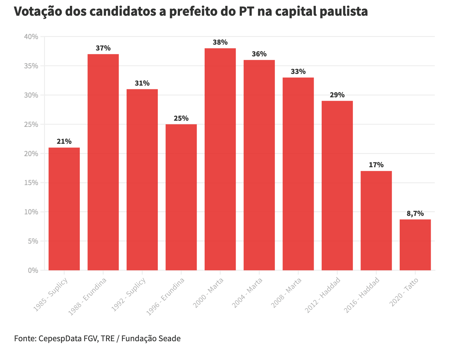 El PT ha hecho una de sus peores elecciones, y la peor elección en San Pablo, su cuna histórica. Con un 8,7 %, su candidato Jilmar Tatto qued´´o en sexto lugar, por detrás del candidato bolsonarista Celso Russomano (cuarto con 10,6 %) y el youtuber Arthur do Val, el “Mamãe Falei” (Patriotas, derecha religiosa, quinto con el 9,7 %).