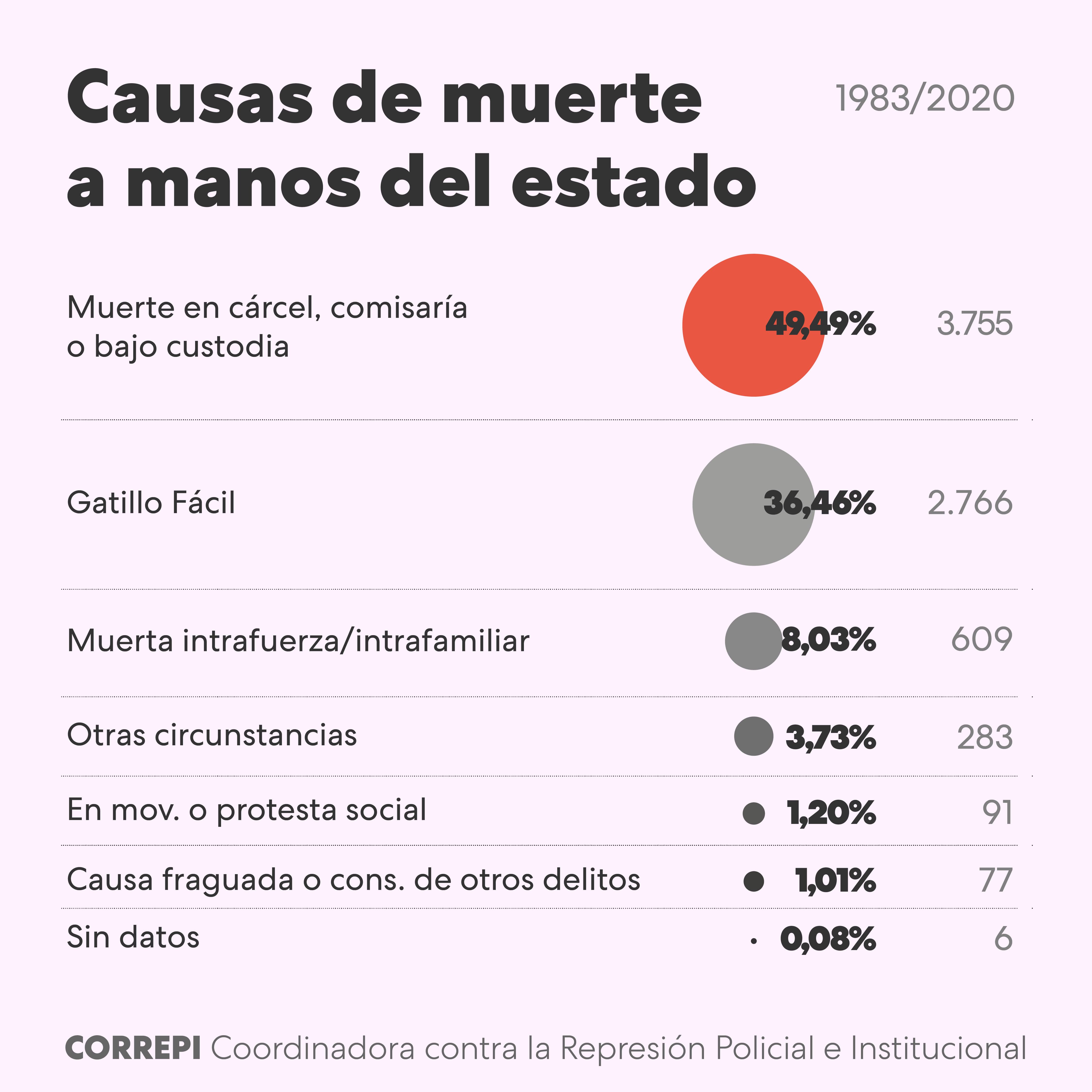 Sin embargo, las decisiones oficiales tomadas durante la pandemia que abarca casi todo este año lo modifican sustancialmente, con gran preeminencia de las muertes en lugares de detención, que suben a más del 66%, lo que hace reducir la incidencia de gatillo fácil a un 25%.