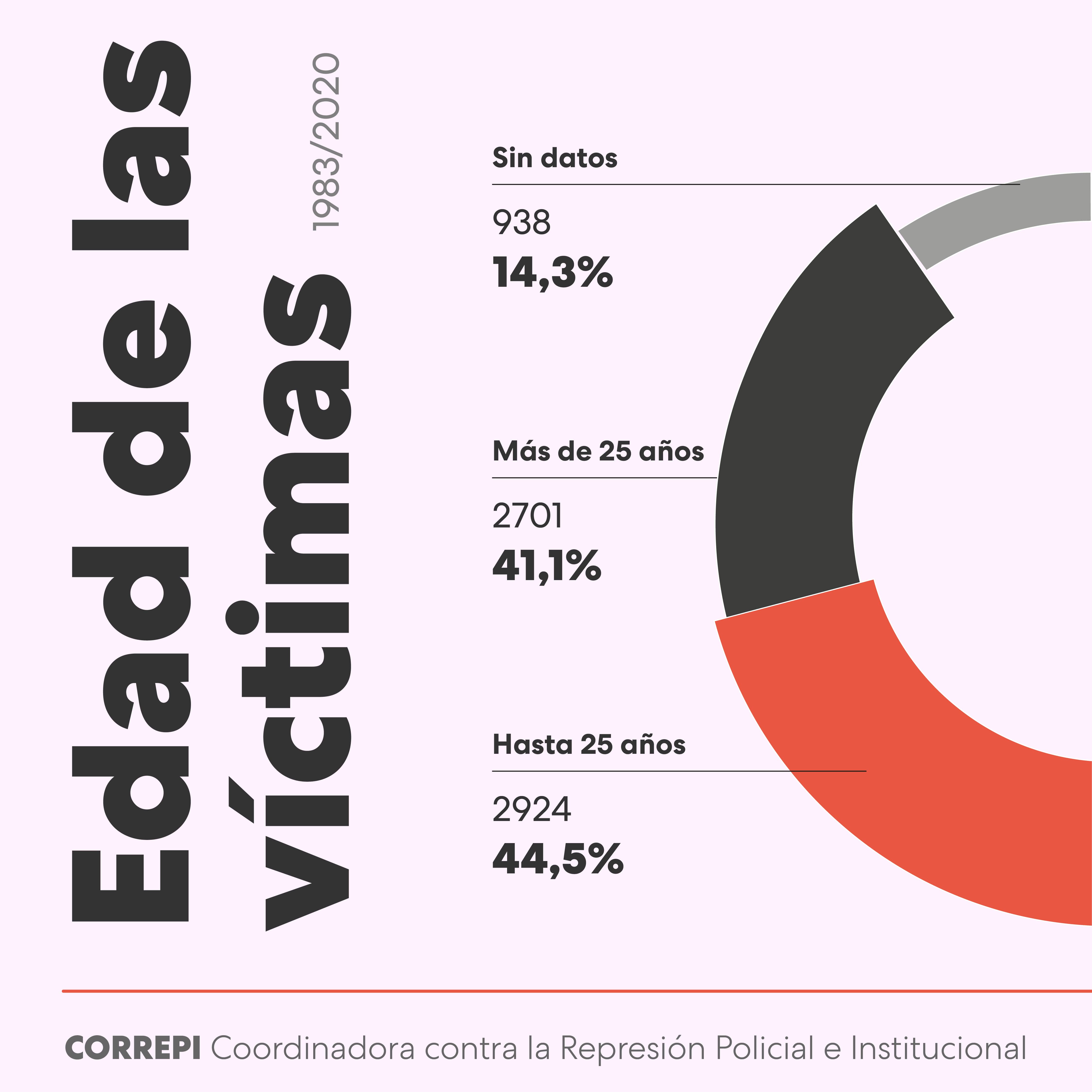 Hay un 19% del total sin datos suficientes, especialmente debido a la falta de información accesible sobre la edad de personas muertas en prisión, aunque los propios informes oficiales, como el de la PROCUVIN, señalan que son personas de menos de 30 años en su mayoría. Aun así, resulta que más de la mitad de los casos en los que se conoce la edad exacta o aproximada de la víctima es de la franja menor de 25 años. El 40% del total corresponde a personas de 25 años o menos.