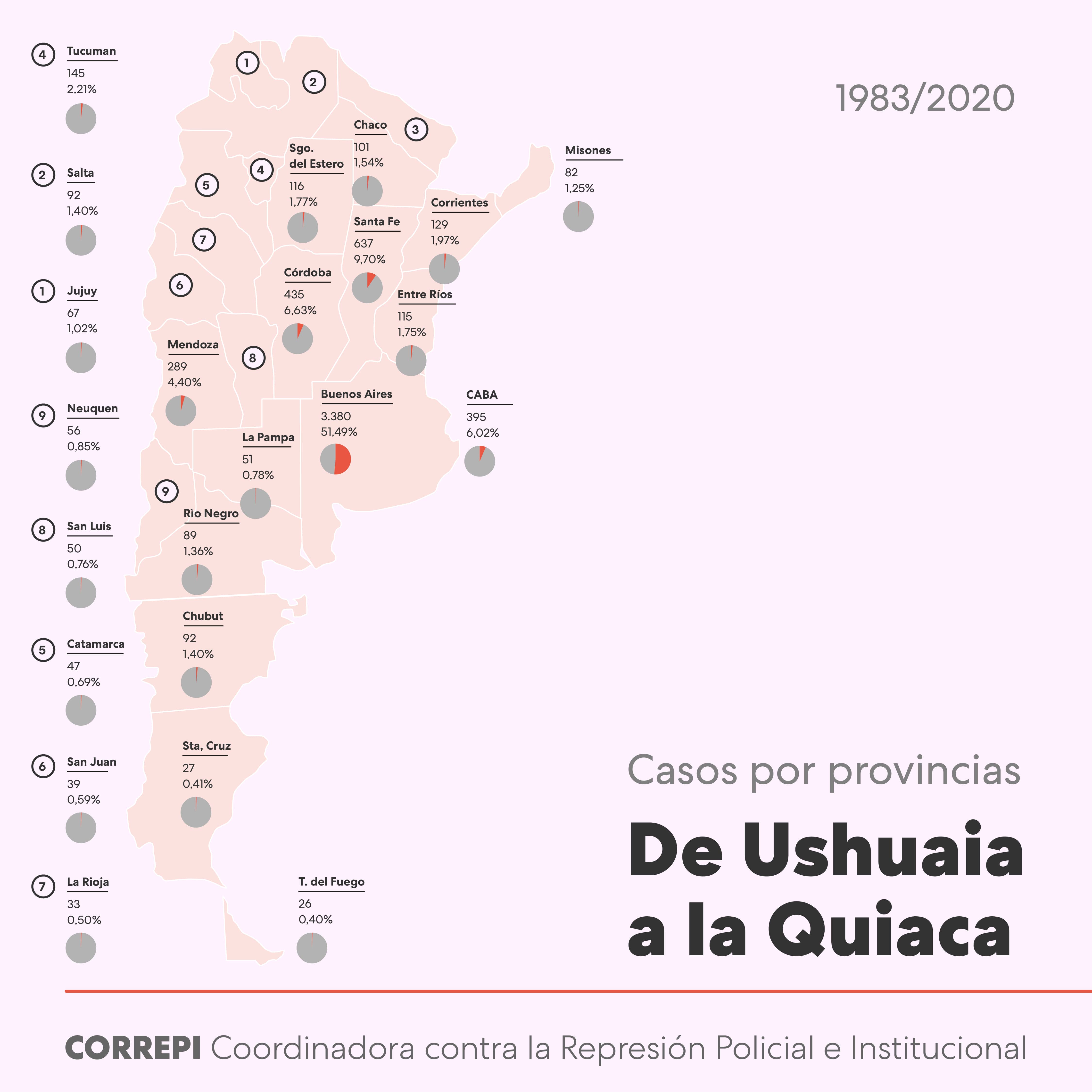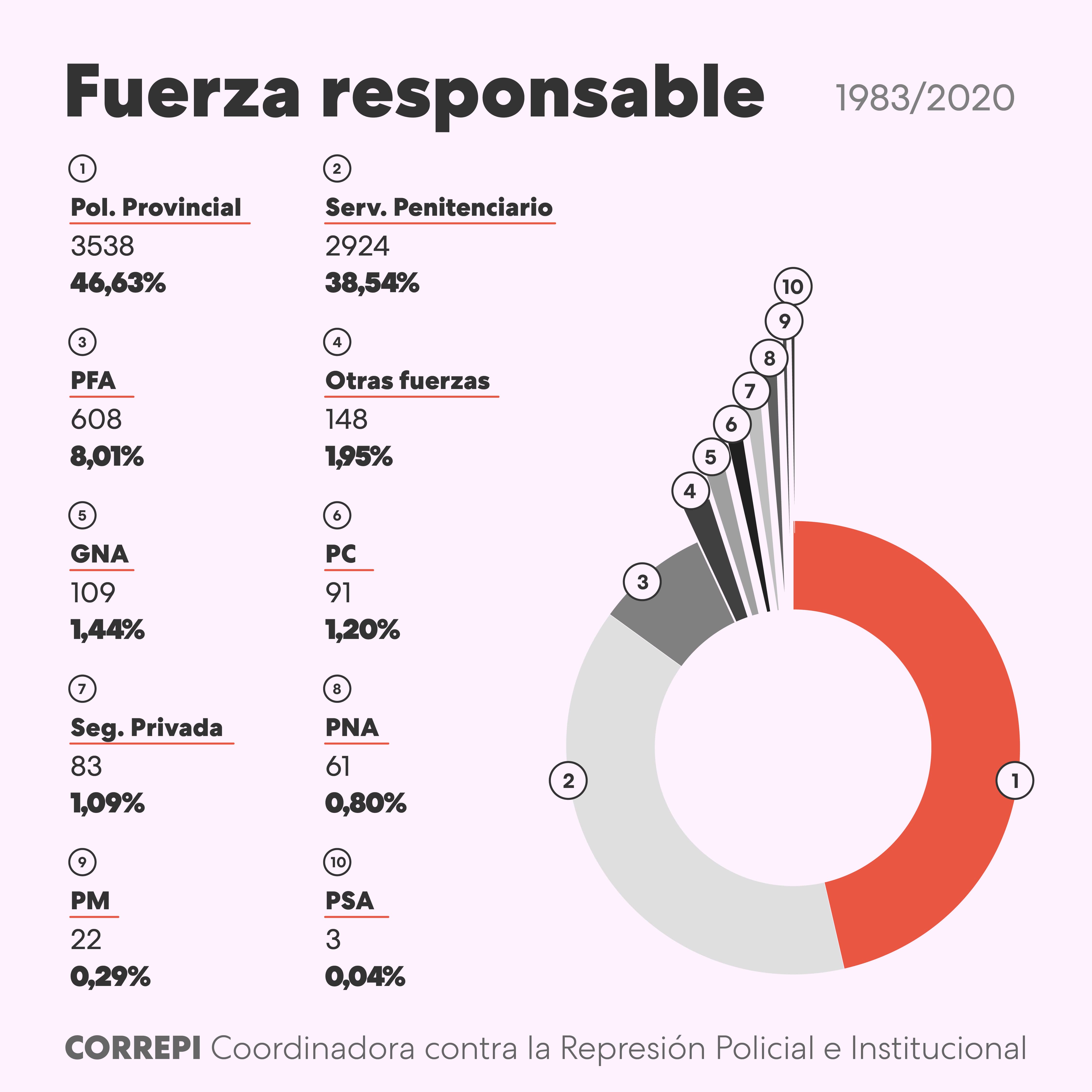Si desglosamos la totalidad de casos registrados desde diciembre de 1983 por fuerza responsable, resulta que las policías provinciales en conjunto ocupan el primer lugar, con el 46,63% de los casos, seguidas de lejos por los servicios penitenciarios federal y provinciales con el 38,54%, y, mucho más lejos aún, la policía federal (8,01%) y con incidencia muy menor el resto de las fuerzas.