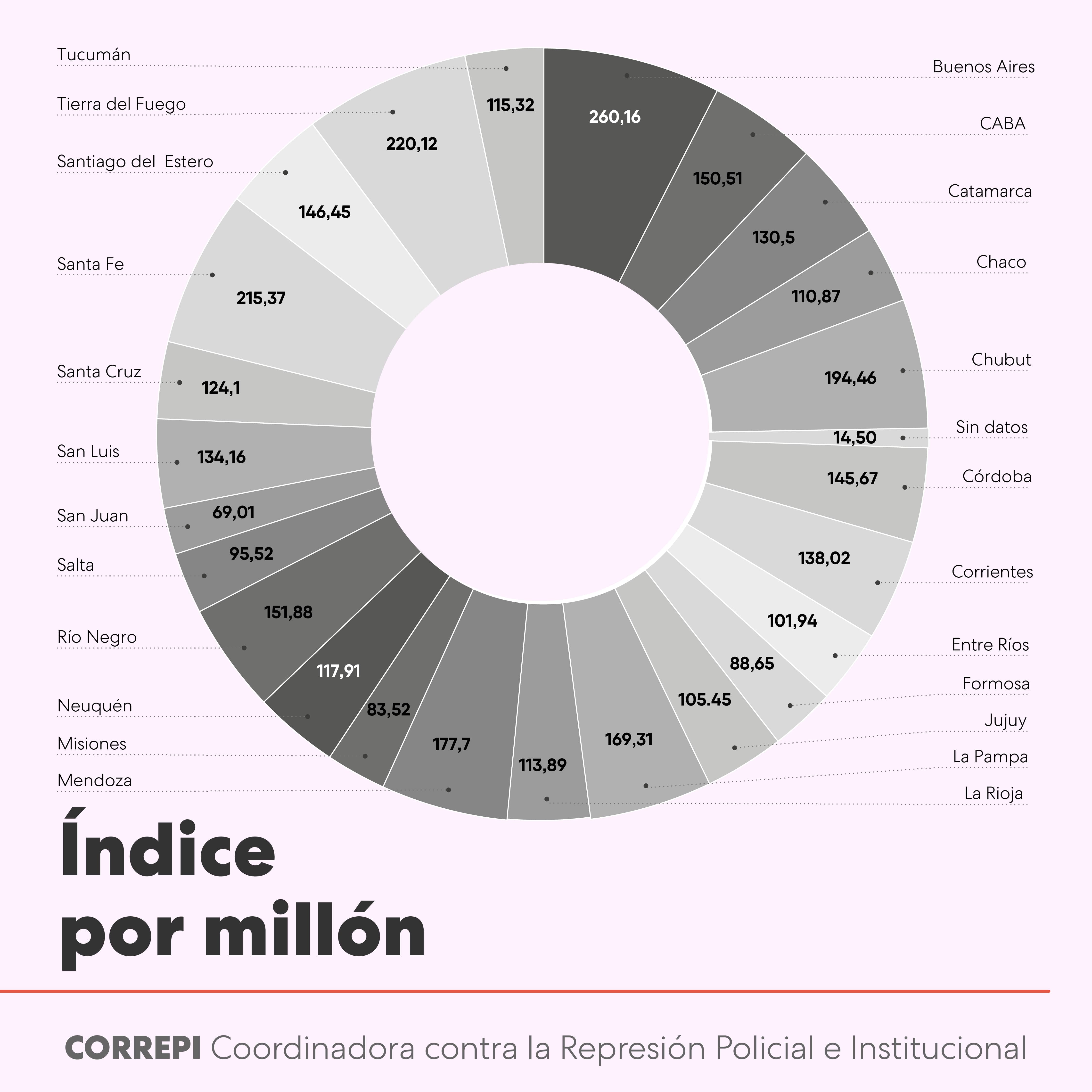 Al obtener un índice por millón de habitantes conforme los datos del último Censo, vemos que la represión se descarga de manera muy uniforme en todo el territorio nacional, con mínimas diferencias entre los distritos, que responden en muchos casos a la falta de suficiente información confiable.
