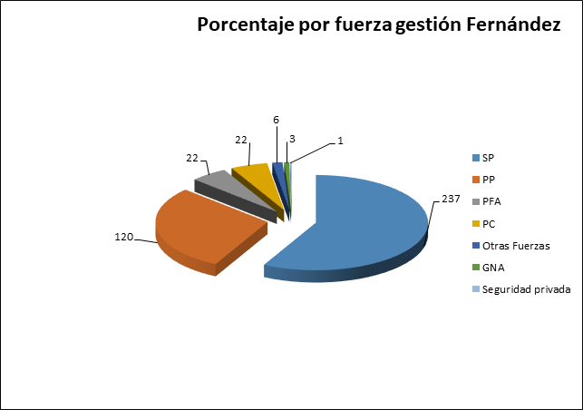 En la siguiente tabla y su gráfico se advierte que no se registran, desde el 10 de diciembre de 2019, casos de responsabilidad de dos fuerzas federales, Prefectura Naval Argentina y Policía de Seguridad Aeroportuaria. Del mismo modo, la incidencia de la Policía Federal bajó de un 8% histórico a poco más del 5% y Gendarmería Nacional bajó de un promedio total de 1,44% a la mitad, 0,73%. También disminuyeron los casos de integrantes de agencias de seguridad privada. También la incidencia de las policías provinciales varió de casi el 47% a un no menos preocupante 29,20%. Por el contrario, los servicios penitenciarios, federal y provinciales, se alzan con un impactante 57,66%, cuando no llegan al 40% en el acumulado total.