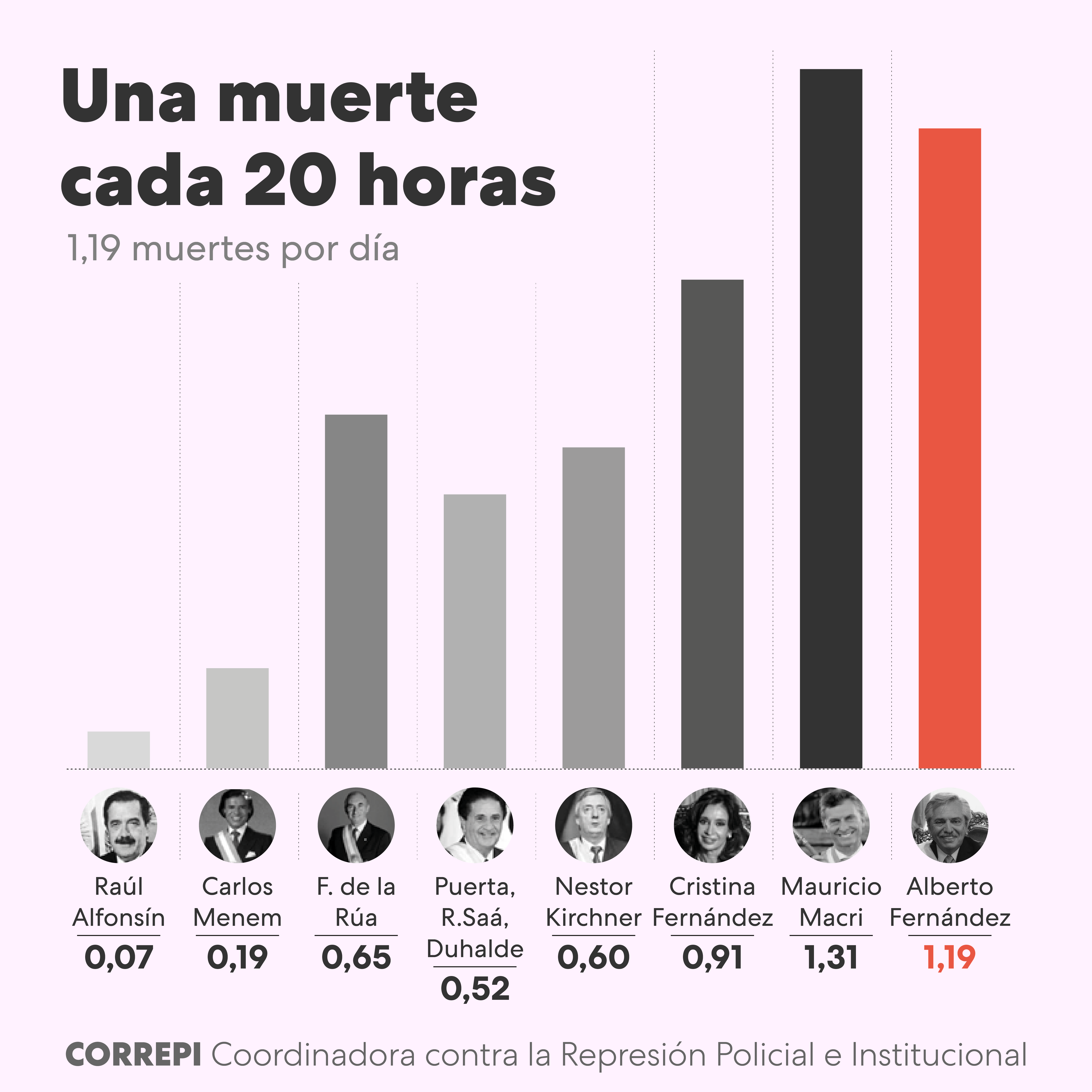 Al término de 2019, cuando presentamos el balance final del período de gobierno de Mauricio Macri, destacábamos que, por primera vez desde 1983, una gestión había superado la marca de una muerte diaria a manos del aparato estatal. Hoy, con la inclusión de registros de 2019 ocurridos o conocidos después de esa publicación, se ratifica que la administración Cambiemos fue la más letal, con un promedio de 1,31 muertes por día. Dicho de otra forma, una muerte cada 18,34 horas.