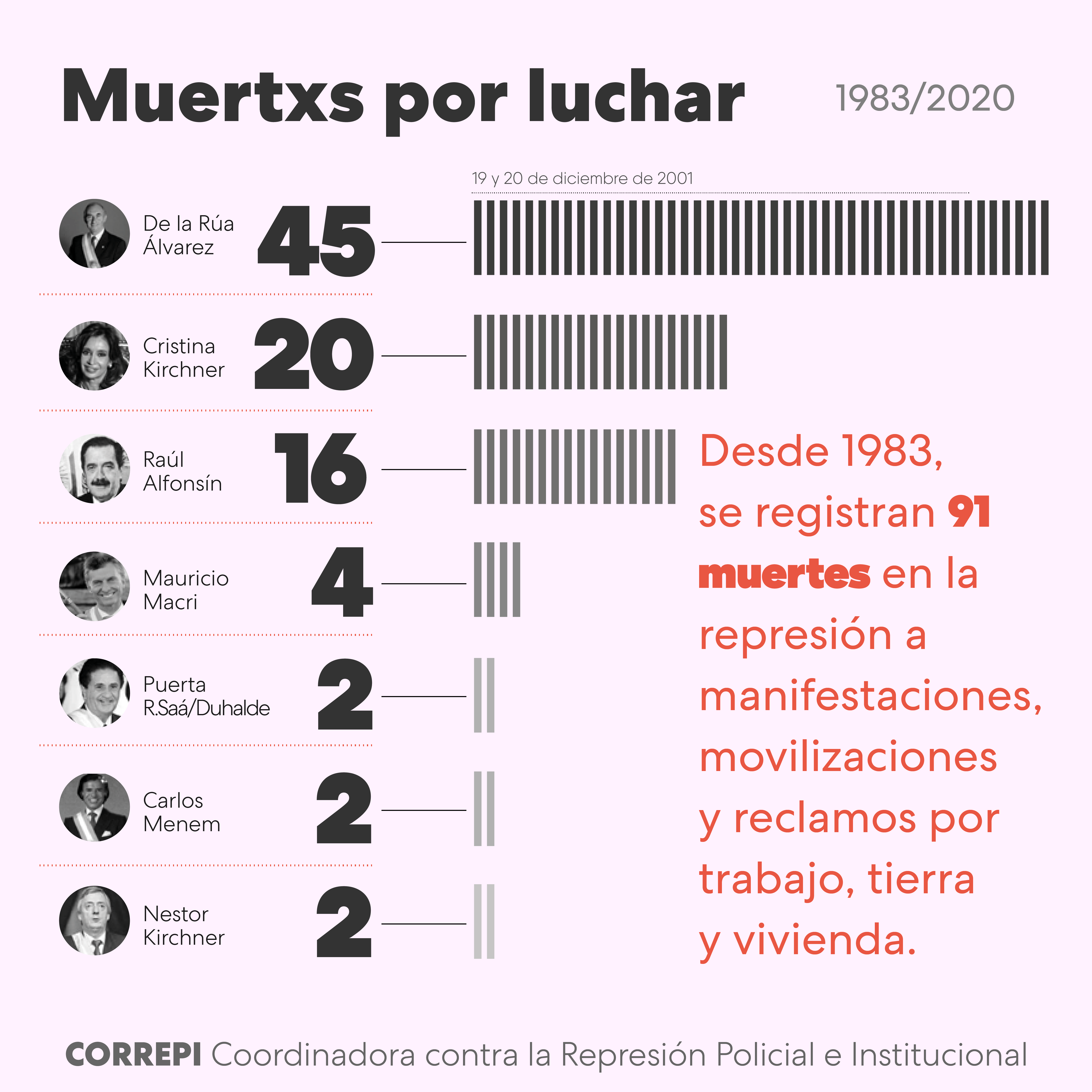 Desde 1983, se registran 91 muertes en la represión a manifestaciones, movilizaciones y reclamos por trabajo, tierra y vivienda. En este rubro, sigue llevando la delantera el gobierno de la Alianza radical-peronista, entre diciembre de 1999 y diciembre de 2001, con un total de 45 asesinadxs, de lxs cuales 39 cayeron el 19 y el 20 de diciembre o murieron posteriormente por las heridas recibidas. Lo escolta el gobierno de Cristina Fernández, con 20, y Alfonsín, con 16 en los saqueos de mayo de 1989. Menem, Duhalde y Néstor Kirchner empatan con dos casos cada uno, superados Mauricio Macri, que sumó a la desaparición y muerte de Santiago Maldonado en Chubut y el fusilamiento de Rafael Nahuel en Río Negro, ambos en el marco de la represión descarnada contra los pueblos originarios en lucha por la recuperación de su territorio, el fusilamiento del niño Ismael Ramírez en Sáenz Peña, Chaco, en la represión a un piquete de desocupados, y a Rodolfo “Ronald” Orellana, militante de la CTEP, en el ataque a una toma de tierras para vivienda en La Matanza.