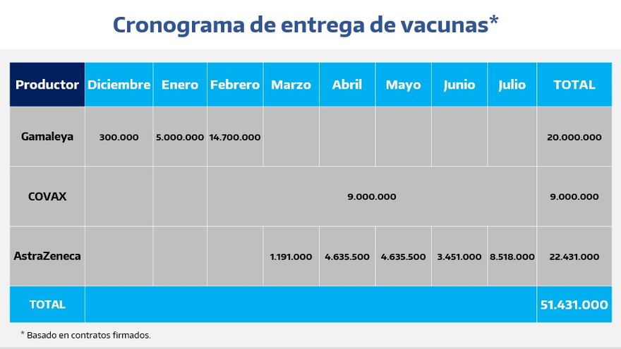 Aquella nota incluía el siguiente gráfico sobre las fechas de llegada de las distintas vacunas: