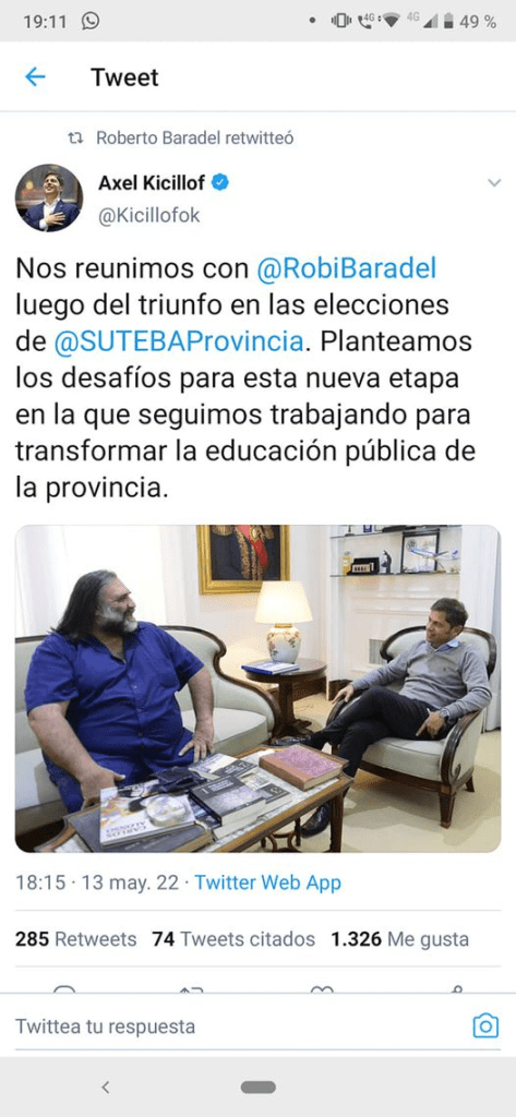 A Roberto Baradel el kirchnerismo no lo quiere, por «piantavotos», en las listas de candidatos a diputados, pero si lo necesita en el sindicato docente, como correa de transmisión de la política educativa y para controlar a la cada vez más pauperizada base docente. Se notó mucho el 10 de mayo, cuando Axel Kicillof anunció un aumento del «60%» el día previo a la elección sindical. El primer tramo de ese aumento los docentes lo cobraron ayer, y no llega al 10%, con una inflación que alcanzó al 23% enero- abril, y que superará el 30% enero- mayo.