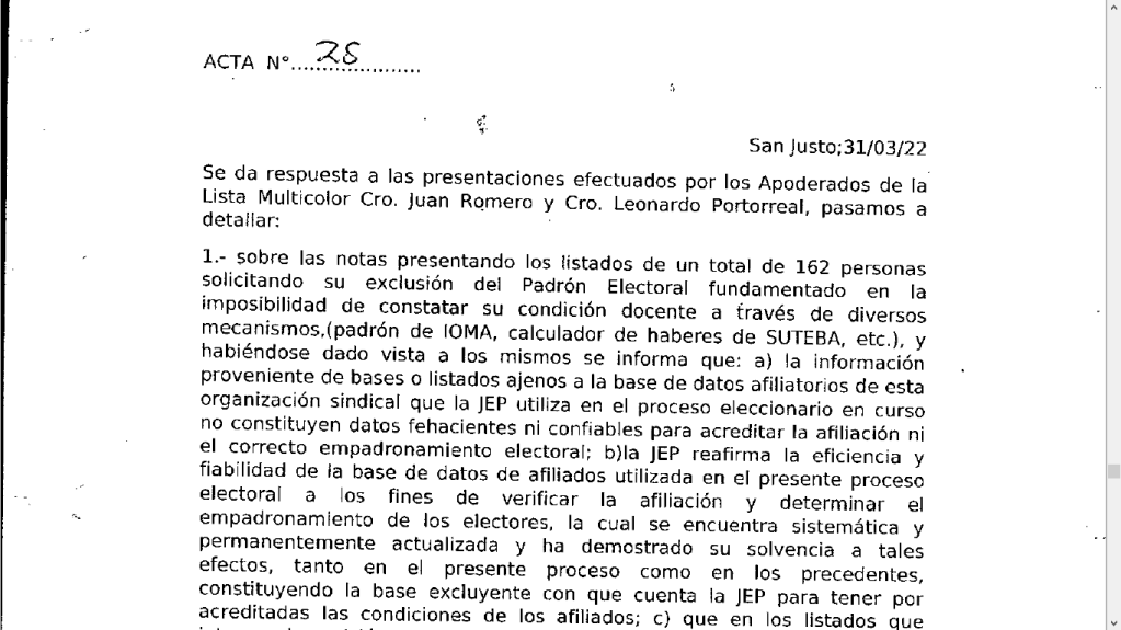 Con firma de su apoderado Juan Romero, la Multicolor matancera pidió la exclusión del padrón electoral del Suteba de 162 personas “…que no figuran ni en el padrón de IOMA ni en el PDD de la DGCyE”. La respuesta de la Junta Electoral es tan impune como absurda: