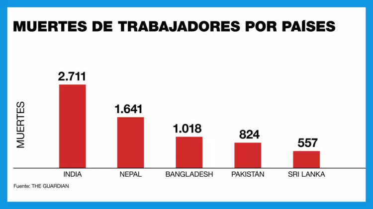 Según un artículo de The Guardian de febrero de 2021, entre 2010, cuando Qatar fue elegida sede del Mundial 2022, y esa fecha, 6500 trabajadores migrantes habían muerto construyendo los estadios. A días del inicio del campeonato organizado por la FIFA, esta nueva nota de The Guardian, basada en un informe de una organización de derechos humanos. da cuenta de las gravísimas condiciones de explotación que sufrieron los obreros en aquel estado teocrático y cuasi medieval, en el que la homosexualidad está considerada como una «debilidad mental».