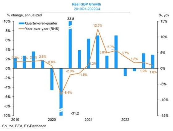 Es una historia similar en los EE.UU. El crecimiento del PIB real de EE. UU. se ha desacelerado del 5,4% interanual en el cuarto trimestre de 2021 a solo el 1% interanual en el cuarto trimestre de 2022 (Greg Daco). Más importante aún, los inventarios (es decir, el almacenamiento de bienes) contribuyeron con más de la mitad de la tasa anual en el cuarto trimestre. Las ventas a los estadounidenses (consumidores y productores) se mantuvieron prácticamente estables, mientras que la inversión empresarial aumentó a una tasa inferior al 2%.