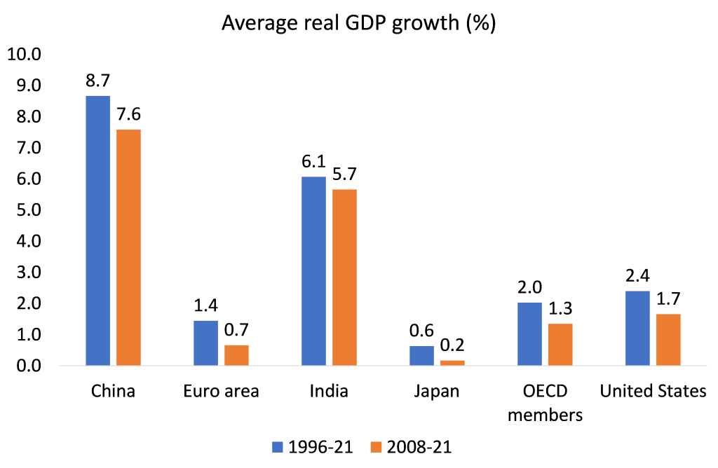 ¿Qué significa esto para el crecimiento del PIB? La economía ‘sobreinvertida’ de China es más de cuatro veces más rápida que las economías de la OCDE dirigidas por los consumidores y un 40 % más rápida que India. Se habló mucho de la política de cero «desastres» de COVID en China. Pero además de salvar millones de vidas, China aún no entró en una recesión en 2020 a diferencia de todas las economías del G7 en 2020.
