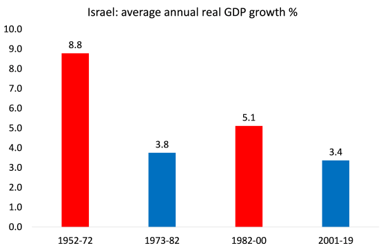 Las crisis económicas han continuado a intervalos regulares en el siglo XXI . En 2003, Netanyahu recortó los beneficios sociales, privatizó más corporaciones estatales, redujo la tasa impositiva máxima sobre la renta, recortó drásticamente los servicios del sector público e impuso leyes antisindicales. Siguió la Gran Recesión de 2008-2009 y luego la caída pandémica de 2020, cuando el PIB cayó un 7%. El relativo declive económico de la economía israelí se revela en la tasa de crecimiento del PIB real en la Edad de Oro, la crisis de rentabilidad de la década de 1970, el período neoliberal y ahora en la Larga Depresión de la década de 2010 en adelante.