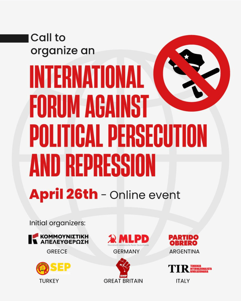 Nuestra intención es crear una red eficaz para luchar contra la persecución de las organizaciones obreras, de solidaridad con Palestina, contra la guerra entre la OTAN y Rusia en Ucrania, contra el militarismo y la militarización de todos los aspectos de la vida social, contra la catástrofe ambiental y contra cualquier ataque a las libertades políticas y las condiciones de vida de las masas trabajadoras. Por ello, invitamos a las organizaciones políticas, sindicales y de derechos humanos, y a todos aquellos que deseen participar, a inscribirse y presentar un breve resumen de los casos de represión o persecución política que deseen denunciar en el foro. Estamos convencidos de que la urgente necesidad de solidaridad de la clase trabajadora contra la represión estatal exige construir un frente unido, superando las diferencias políticas existentes dentro de nuestra clase, para contraatacar unidos.