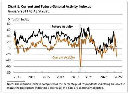En segundo lugar, las oficinas regionales de la Reserva Federal de EE. UU. realizan una encuesta mensual sobre el sentimiento económico y el progreso del sector manufacturero. Las encuestas más recientes muestran indicios significativos de desaceleración y una recesión declarada. La encuesta de manufactura de la Fed de Nueva York de abril mostró una perspectiva empresarial de -7,4 (44 puntos menos en los últimos tres meses), la más débil desde 2001 y la segunda más baja en la historia de la encuesta. « Las empresas esperan que las condiciones empeoren en los próximos meses, un nivel de pesimismo que solo se ha presentado en contadas ocasiones en la historia de la encuesta». La encuesta de la Fed de Filadelfia informó que «los nuevos pedidos cayeron drásticamente, de 8,7 en marzo a -34,2 en abril, su nivel más bajo desde abril de 2020».
