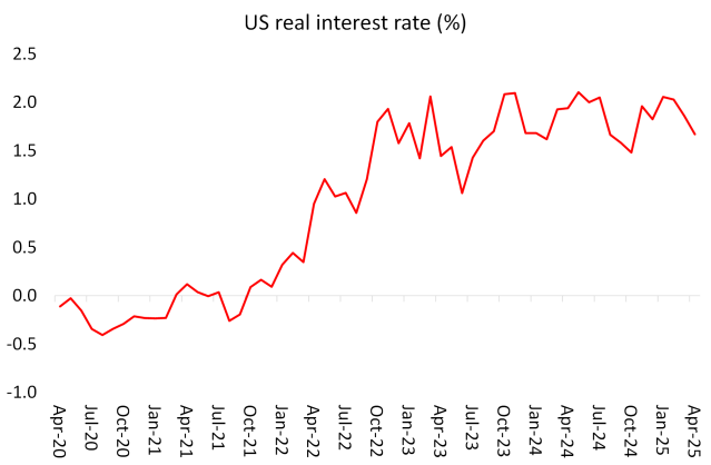 Sin embargo, el entorno de bajos tipos de interés para las empresas de la década de 2010 ha llegado a su fin. Los tipos de interés reales (es decir, una vez deducida la inflación) se encuentran en su nivel más alto desde justo antes de la crisis financiera mundial de 2008. Esto me sugiere que si la guerra arancelaria de Trump empieza a afectar los ingresos corporativos en EE. UU. y en otros países, y al mismo tiempo aumenta la inflación y los tipos de interés, la presión sobre las ganancias se intensificará.