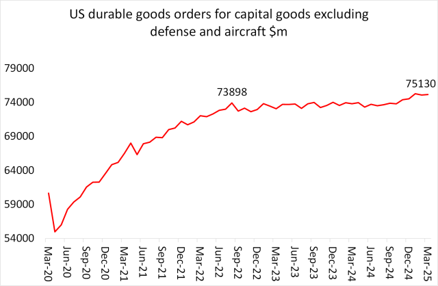 En cuanto a la inversión en sectores productivos de la economía (el mercado principal), las empresas estadounidenses, salvo las que invierten fuertemente en capacidad de IA, no están actuando. Los pedidos de bienes de capital duraderos no destinados a la defensa (es decir, los que no se destinan a la fabricación de armas) han aumentado solo un 1,6 % desde 2022.