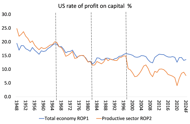 Esta falta de inversión productiva es llamativa y estructural. Se debe a cambios a largo plazo en la rentabilidad de los sectores productivos de la economía estadounidense. La brecha entre la tasa de ganancia de la economía en su conjunto y la tasa de ganancia de los sectores productivos de la economía estadounidense se ha ido ampliando desde principios de la década de 1980. Si bien la tasa general se ha mantenido prácticamente estática desde 1997, la rentabilidad de los sectores productivos, tras un modesto aumento en la década de 1990, ha disminuido drásticamente desde entonces. Por ello, las empresas estadounidenses están destinando gran parte de sus beneficios a la recompra de acciones para impulsar el alza de los precios o al aumento de los dividendos a los accionistas.