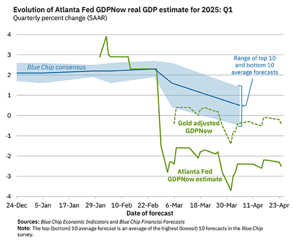 Luego están los pronosticadores del PIB que utilizan diversos indicadores económicos para pronosticar el crecimiento de EE. UU. en cada trimestre. El más seguido es el pronóstico GDP Now de la Fed de Atlanta . La estimación del modelo GDPNow para el crecimiento del PIB real en el primer trimestre de 2025 es del -2,4 % y, tras ajustar por las operaciones excepcionales con oro, del -0,4 %. Por lo tanto, la Fed de Atlanta considera que la economía estadounidense estuvo estancada, en el mejor de los casos, entre enero y marzo. Esto contrasta con el pronóstico de consenso de los economistas, que se sitúa en el 0,4 %.