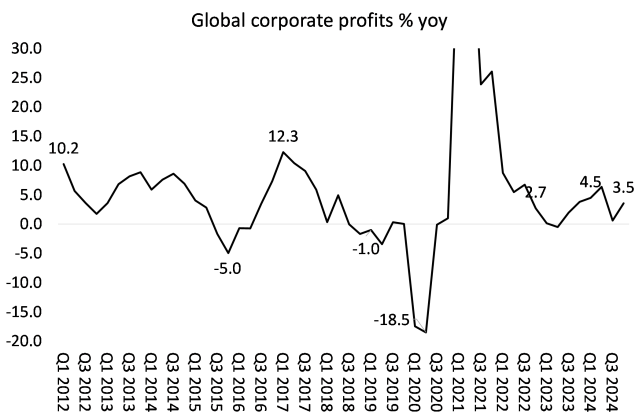 Para mí, la mejor guía para saber si habrá una caída es lo que está sucediendo con las ganancias corporativas. Las empresas estadounidenses informarán sobre sus resultados financieros en las próximas semanas. Pero si observamos las cifras oficiales de ganancias corporativas hasta el cuarto trimestre de 2024, todo parece razonablemente bien. Las ganancias corporativas estadounidenses han aumentado notablemente desde el inicio de la pandemia de COVID-19, alcanzando cerca de los 4 billones de dólares a finales de 2024. Las ganancias de las industrias no financieras nacionales, que promediaron el 8,1% del ingreso nacional durante el período 2010-19, aumentaron al 11,2% en el último trimestre de 2024. En relación con el ingreso nacional, esto representa un aumento del 2,3% en comparación con la pandemia. A nivel mundial, las ganancias corporativas también siguen aumentando, aunque a un ritmo relativamente débil.
