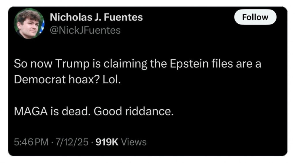 ¿MAGA se distancia de Trump a causa del escándalo Epstein? «El clavo en el ataúd», publicó el influencer de derecha Evan Kilgore en X. «No voy a defender esto. Me da asco».