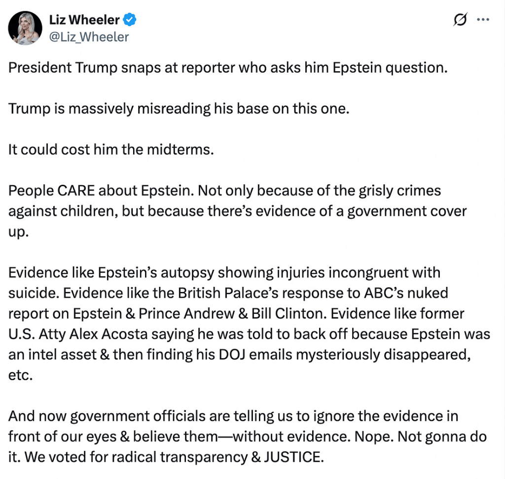 Así que ha sido bastante sorprendente esta semana descubrir que, de hecho, existe una línea roja para algunos partidarios de Trump, al menos para el ala QAnon de MAGA, que genuinamente creía que existía algún tipo de red de pedofilia demócrata de la élite que Trump había sido enviado por Dios para exponer, y para aquellos influencers de derecha habituales que creyeron a Trump cuando prometió que publicaría la «lista de Epstein» (una lista de clientes presuntamente incriminatoria del violador de menores convicto y multimillonario amigo de Trump, Jeffrey Epstein), exonerándose así a sí mismo e implicando a Bill Clinton (y otros) de una vez por todas. La fiscal general Pam Bondi había llegado al extremo de decirle a Fox News en febrero, justo después de la investidura de Trump, que la lista de clientes de Epstein ya estaba «sentada sobre mi escritorio», lo que hizo que MAGA se enfureciera al ver que su teoría de la conspiración sobre los Clinton habiendo asesinado a Epstein se demostrara cierta.