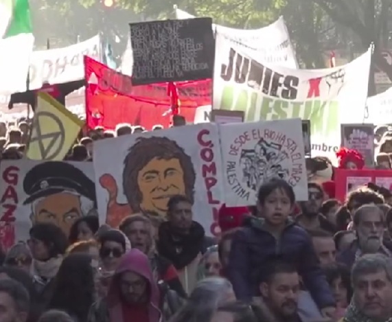 En Buenos Aires, capital de la Argentina gobernada por Javier Milei, amigo del carnicero Netanyahu, y donde la influencia de las organizaciones sionistas como la DAIA es muy grande, unas 10 mil personas marcharon convocadas por el Comité Argentino de Solidaridad con el Pueblo Palestino a la Plaza de Mayo.