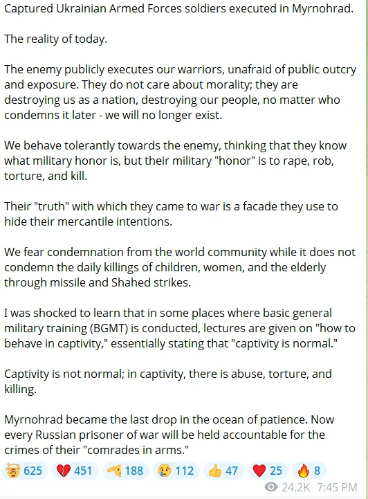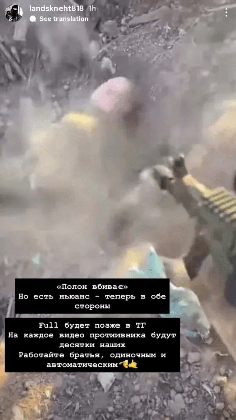 En una publicación que aún está en pie, nuevamente llamaron a matar prisioneros de guerra para no terminar como «terpila» (jerga de la prisión rusa traducida como «perdedores»).