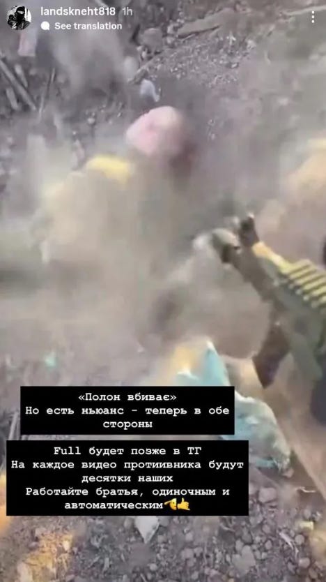 Empecemos. Aquellos que han pasado algún tiempo en la aplicación Everything en x.com estarán bastante familiarizados con los videos que representan alegremente el asesinato de soldados indefensos. En 2022, hubo bastantes videos de este tipo del lado ucraniano. Recuerdo en particular el de los soldados rusos capturados por la Liga Internacional de la captura de soldados rusos cerca de Kiev. Parece que recuerdo algunos videos de ganchos de rodilla también. El famoso video de un soldado ucraniano cocinando y comiendo un cráneo ruso también fue un punto culminante.