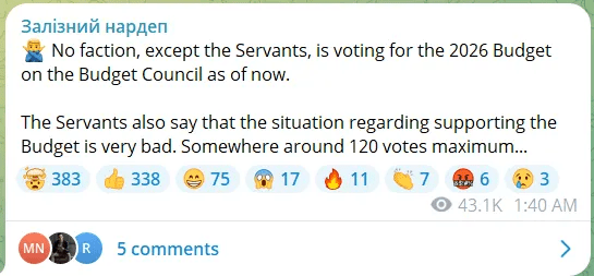 Actualmente, la principal tarea de los Servidores es aprobar el presupuesto de 2026. No parecen estar haciéndolo muy bien, lo que augura un mal futuro para el poder parlamentario de Zelenski. El diputado de la oposición Yaroslav Zheleznyak escribió lo siguiente al respecto el 2 de diciembre: «Ninguna facción, excepto los Servidores, está votando por el presupuesto 2026 en la Comisión de presupuesto hasta ahora. Los Servidores dicen que la situación en relación al apoyo al presupuesto es muy mala. Alrededor de 120 votos como máximo».